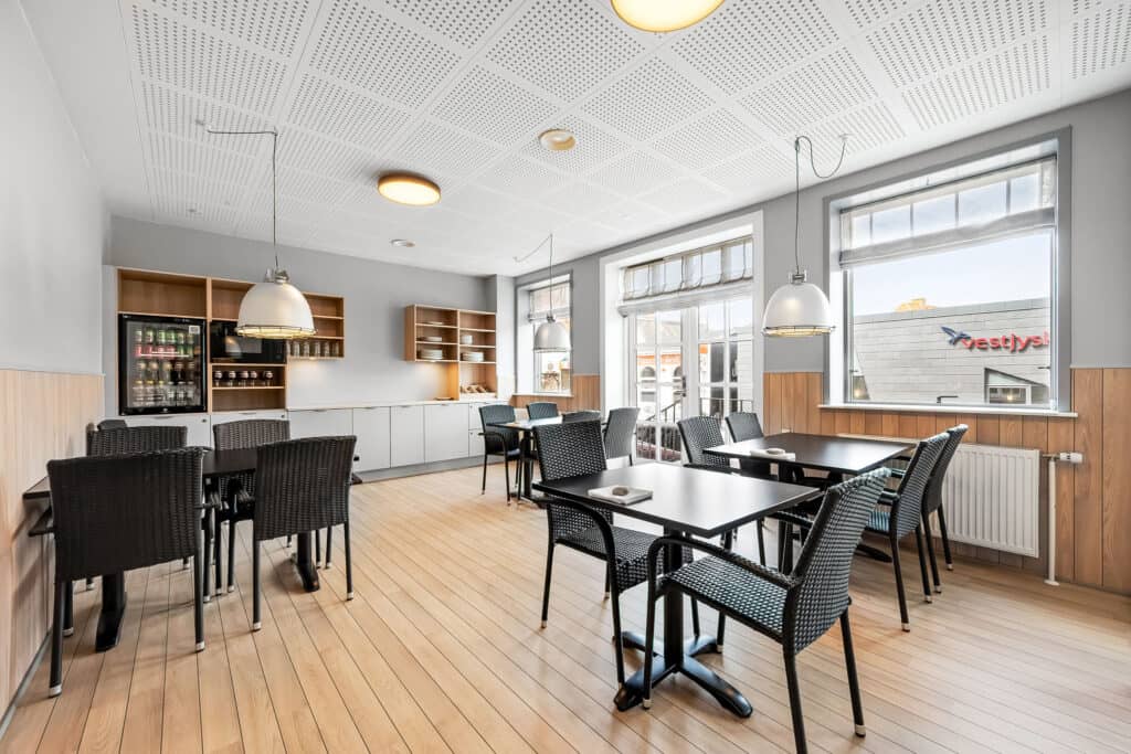 Hotellet har en kaffestue, hvor du er velkommen til at sætte dig og nyde en kop the eller kaffe. Hvis du besøger en af de lokale fiskebutikker og køber lidt lækkert fisk her eller køber mad andre steder, er du også meget velkommen til at spise din mad i kaffestuen. I kaffestuen kan du købe øl, vand og sodavand. Der er vand, danskvand, hvidvin og rødvin på hane. Dette er inkluderet i bookingen.